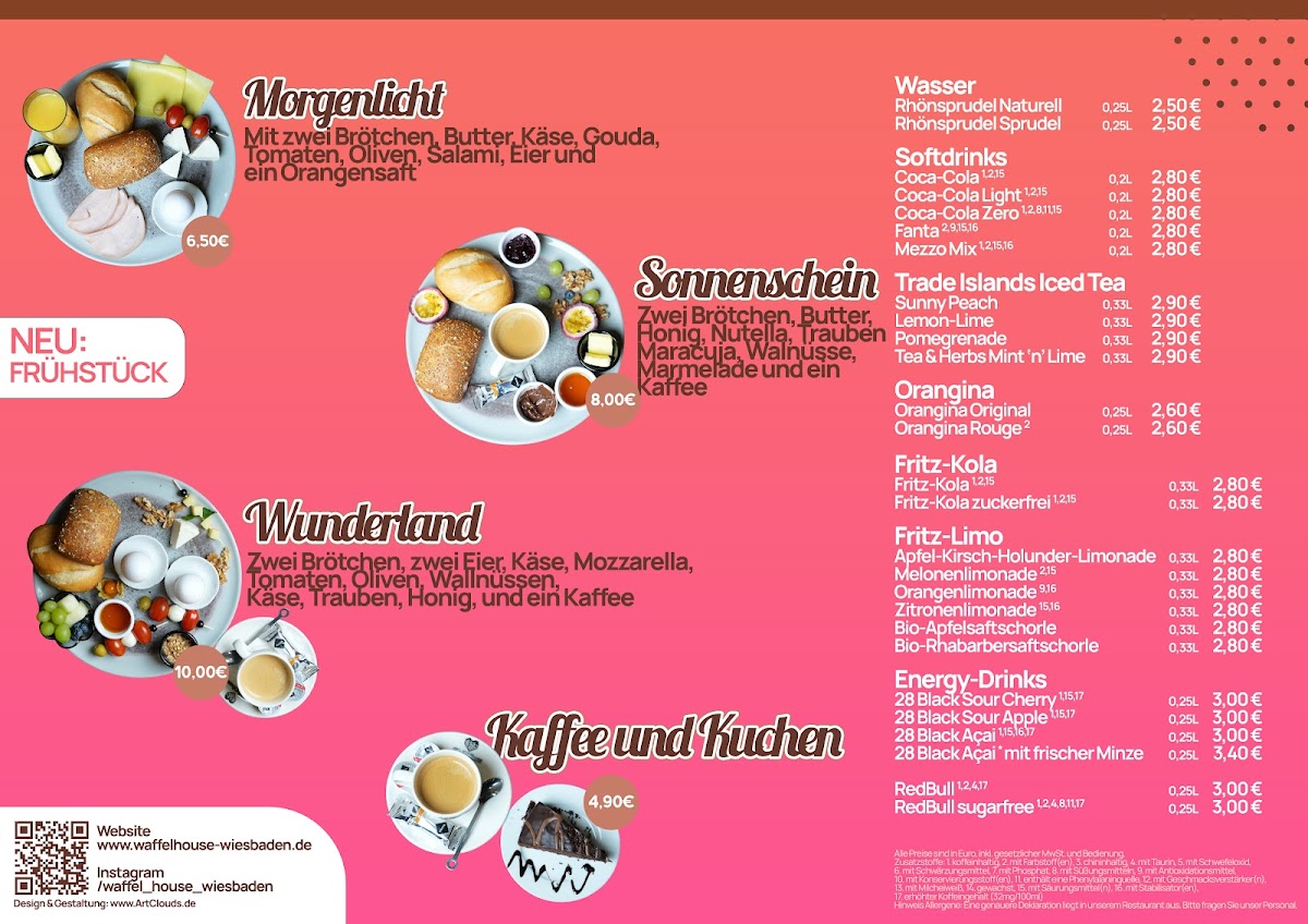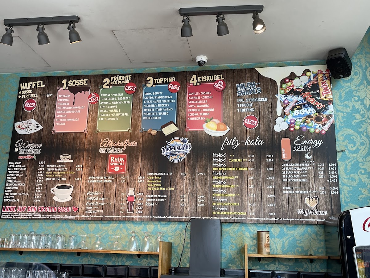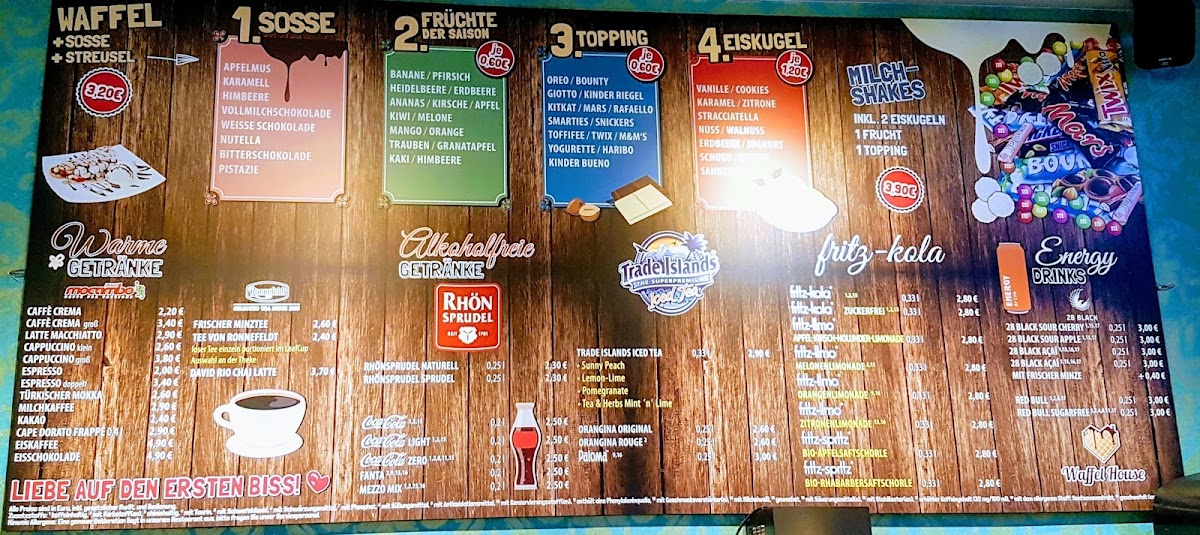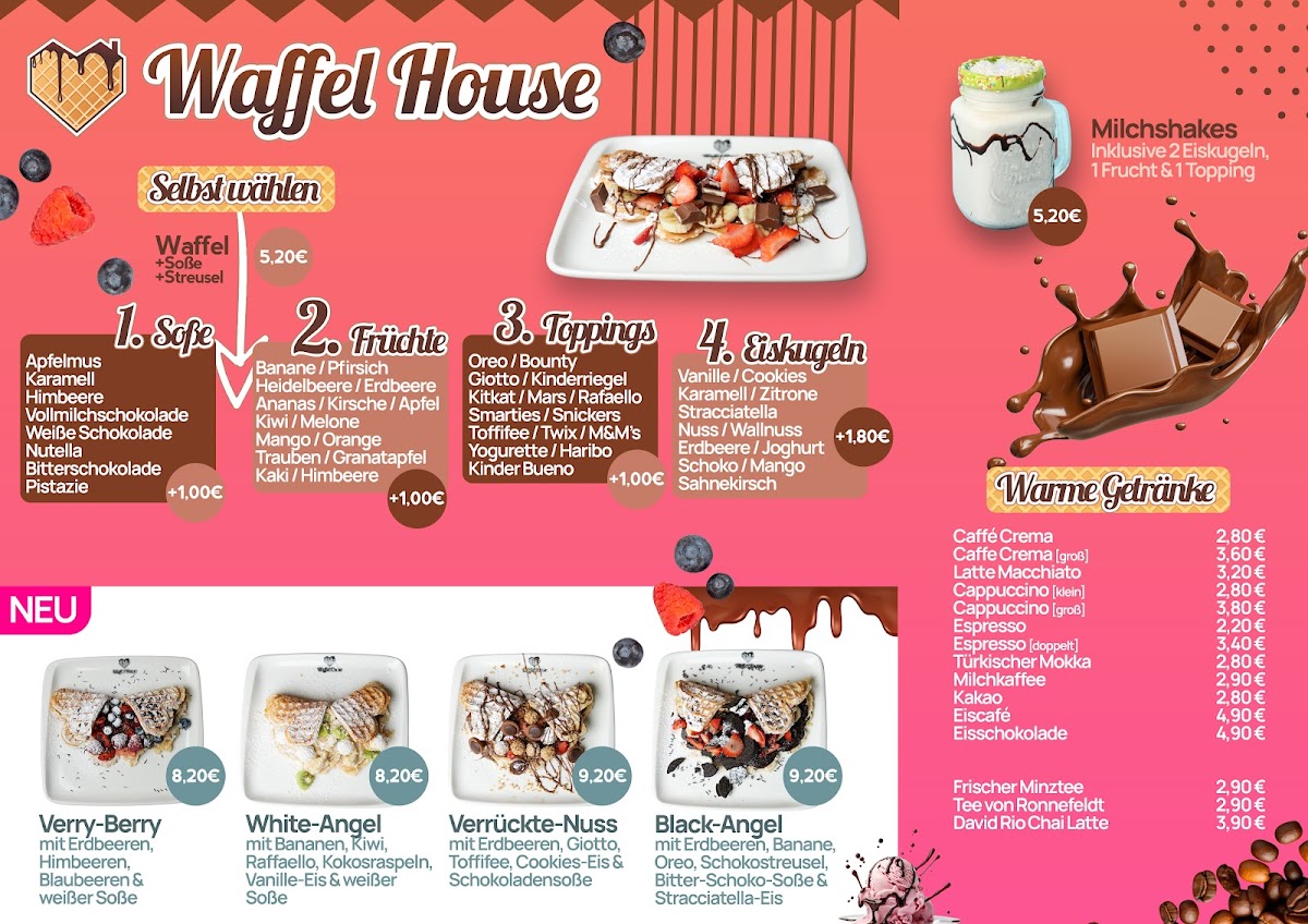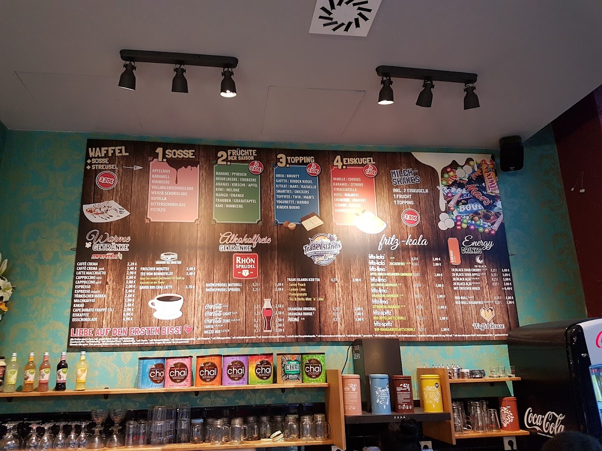 The menu at Waffle House Wiesbaden offers a focused selection of sweet waffles and classic coffee drinks that work well together for a satisfying dessert or light café experience. The waffles are clearly the highlight, with combinations that balance sweetness and fruit particularly well. The Waffel Mit Karamell Und Bananen stands out as a comforting choice with its rich caramel and soft banana pairing, while the Waffel Mit Nutella Mango Und Bounty is more adventurous, combining chocolate, tropical fruit, and coconut for a more indulgent flavor profile. For those who prefer a slightly tart contrast to sweet chocolate, the Waffel Mit Nutella Und Himbeeren offers a pleasant balance and feels less heavy while still being satisfying. To accompany the waffles, the Cappuccino is a reliable choice, rounding out the meal with a smooth, slightly bitter note that complements the sweetness of the desserts. Overall, the menu is not overly large, but it is well-curated, focusing on combinations that are both visually appealing and flavorful, making it a good spot for anyone looking to enjoy creative waffle desserts and a relaxed coffee break.